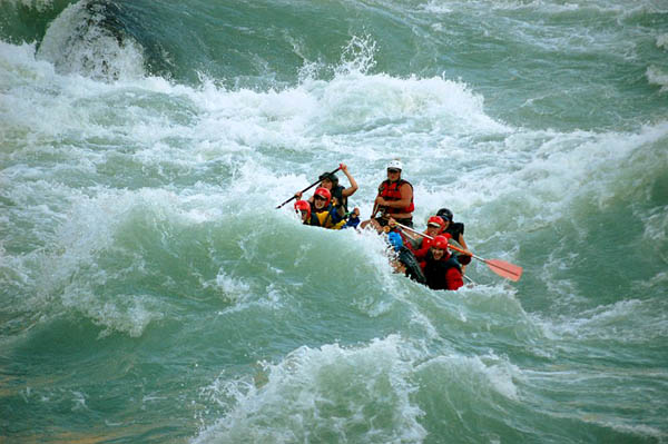 - Туристы сплавляются на рафтах, безопасность обеспечивается катамараном-двойкой или каяком;